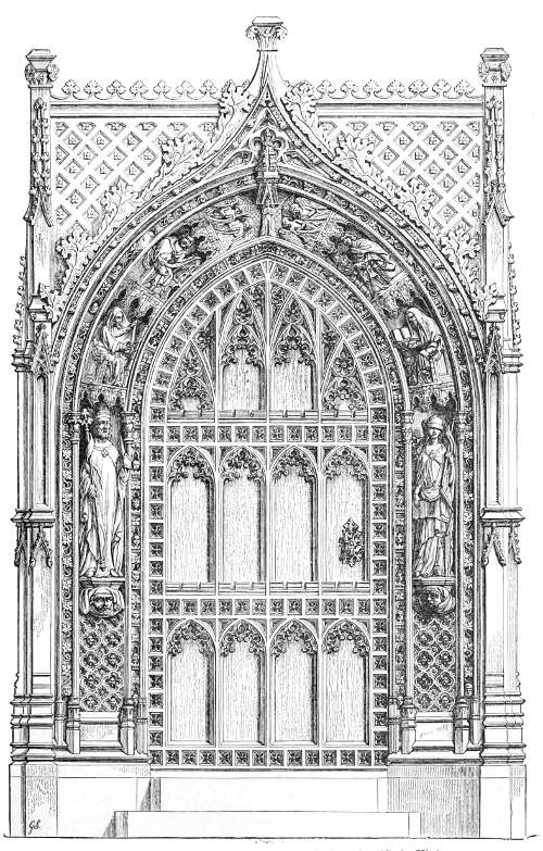 99. The proper effect of this part of Ely Cathedral has been seriously marred by the erection of the new reredos. In itself a fair specimen of modern Gothic, it is placed so far from the choir as to lose its proper effect. It is painfully dwarfed by the large plain area in front of it. But worse than this, it cuts up and destroys the most beautiful presbytery in England after the Angel Choir at Lincoln. The architects of Walsingham’s time glazed two compartments of the triforium to throw light upon the principal object in the choir, which was intended to stand two bays farther forward. It would have been well if the 19th-century restorers had taken the hint.