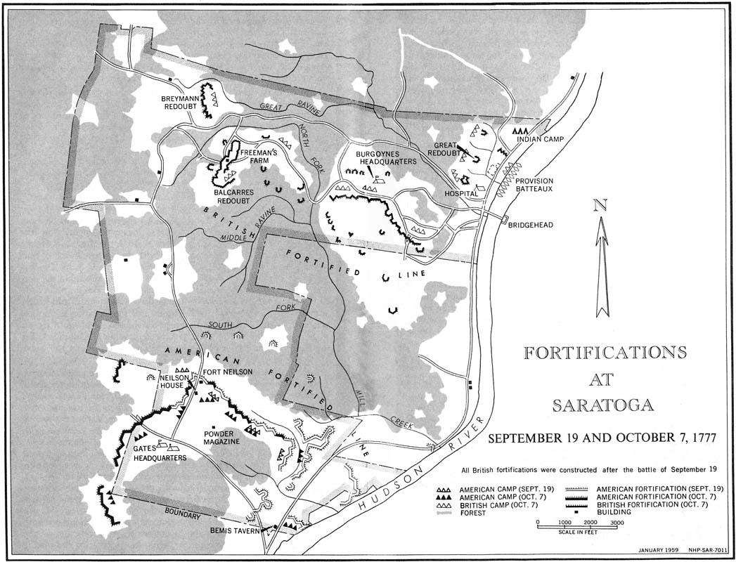 American scouts from the east side of the Hudson detected the forward movement of Riedesel’s column along the river road. When Gates was first advised by his scouts of the British advance, he determined to await their attack behind his breastwork. Arnold, however, insisted that the issue should be fought in the field. He reasoned that the forest would not only handicap the British from the standpoint of coordinated attack and the full use of their artillery, but it would also offer a screen peculiarly adaptable to the American style of fighting. If defeated in the field, he argued, the troops could then fall back to their entrenchments.