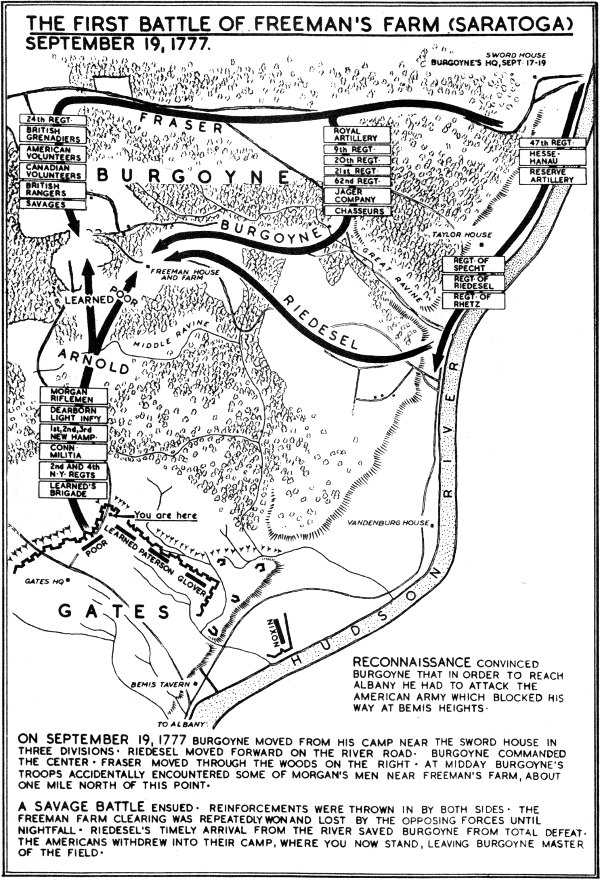 ON SEPTEMBER 19, 1777 BURGOYNE MOVED FROM HIS CAMP NEAR THE SWORD HOUSE IN THREE DIVISIONS. RIEDESEL MOVED FORWARD ON THE RIVER ROAD. BURGOYNE COMMANDED THE CENTER. FRASER MOVED THROUGH THE WOODS ON THE RIGHT. AT MIDDAY BURGOYNE’S TROOPS ACCIDENTALLY ENCOUNTERED SOME OF MORGAN’S MEN NEAR FREEMAN’S FARM, ABOUT ONE MILE NORTH OF THIS POINT.