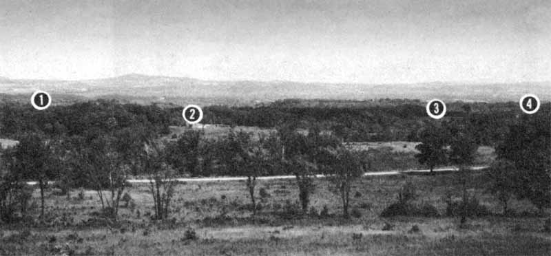 View east from Fraser’s Hill with the Hudson Valley Hills and Green Mountains in the distance, showing the terrain held by the British line and the ground most bitterly fought over in the battle of October 7. On the bluffs overlooking the river is the site of the Great Redoubt (1) where Fraser was buried and from where the British began their retreat northward to Saratoga (now Schuylerville). The Breymann Redoubt (2) was in the cleared area adjacent to the woods. The Freeman Farm (3), where the battle of September 19 began, was later included within the British lines. The Balcarres Redoubt ran from the Freeman Farm right to (4).