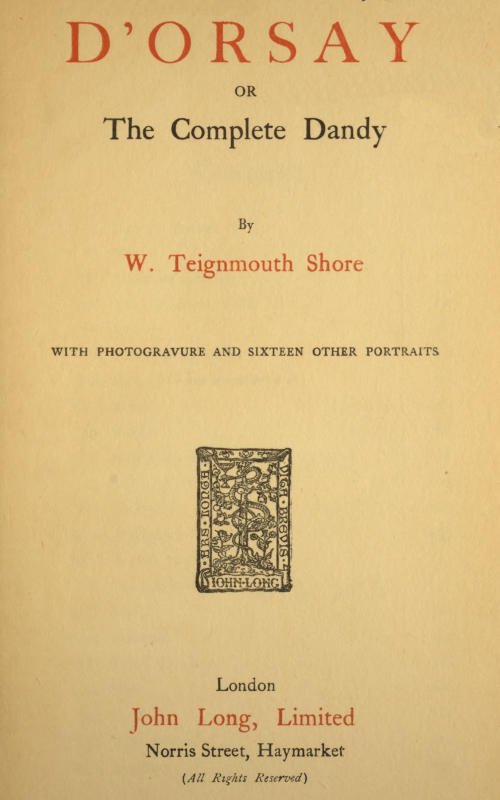 It is as a dandy that D’Orsay must be judged, and in that rôle he achieved triumph. It was as a dandy he lived and as a dandy that he is immortal. Such men as he, if indeed there are others with his genius, should—as we have said—be pensioned by the State, should be set above the carking cares of questions of want of pounds—shillings and pence do not trouble them; they should be cherished and sustained as rarely-gifted and rare beings, to whom life presents not any serious problems, and to whom life is a space of time only too brief for all the pleasures which should be crowded into it. “Life’s fitful fever” should be kept apart from such sunny souls, and our only regret should be that there are so few of them.