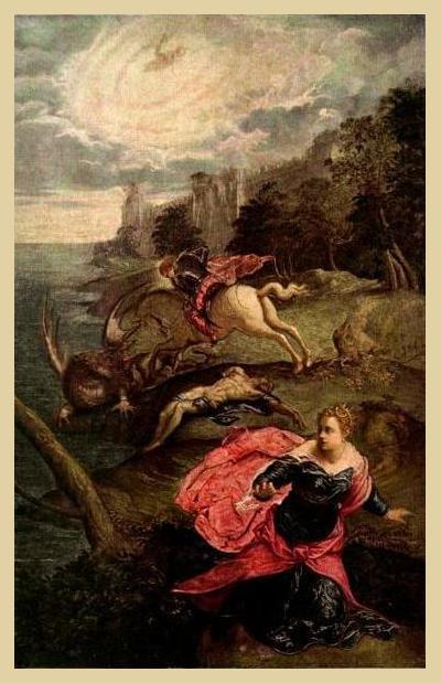 Tintoret avait déjà traité le même sujet avec une variante. Dans le Saint Georges et la Princesse, qui se trouve au Palais ducal à Venise, la Foi, représentée par la princesse, est victorieuse du Dragon sur le cou duquel elle est assise à califourchon et qu’elle maîtrise à l’aide d’un ruban qui lui sert de bride. Derrière elle, saint Georges étend les mains comme pour bénir, tandis qu’un moine, placé à droite du tableau, contemple gravement cette scène.