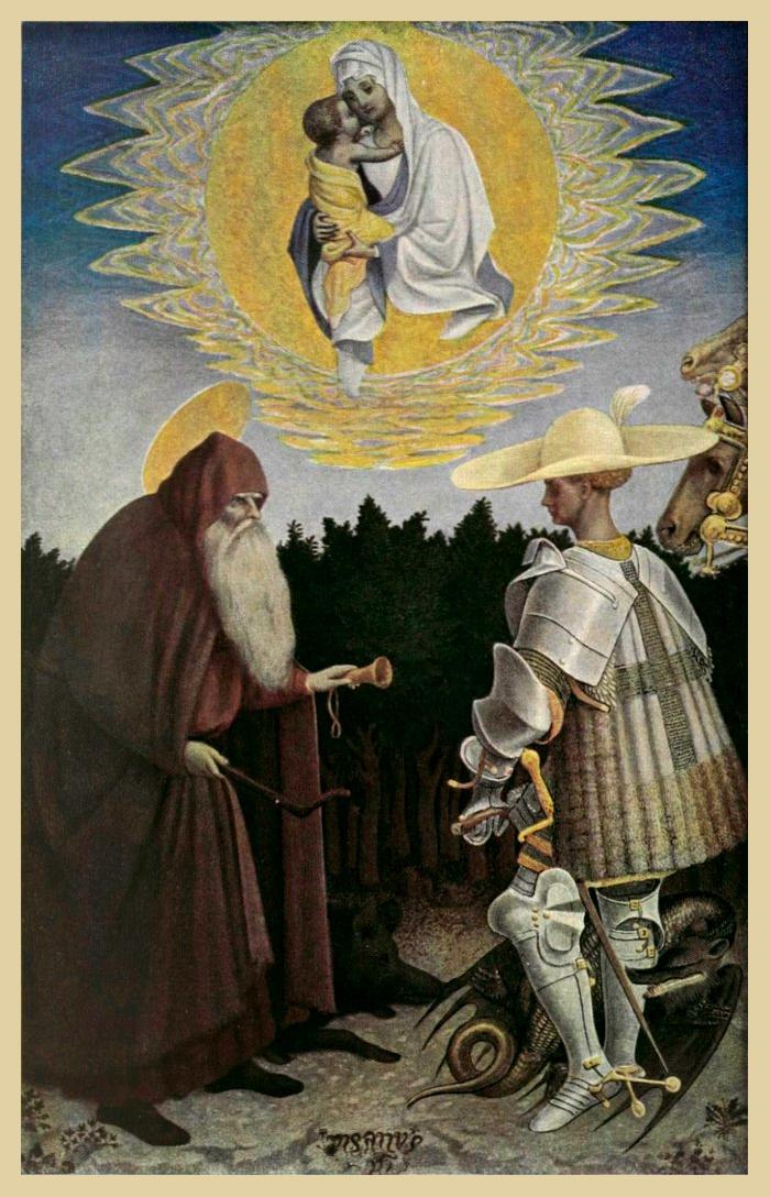 Dans ce tableau célèbre, Tintoret a concrétisé, pour ainsi dire, la belle légende chrétienne du Ciel protégeant la Foi contre les attaques du Démon. La Foi se trouve représentée sous les traits de cette princesse blonde, belle, parée de vêtements somptueux qui symbolisent l’éclat de la vertu. Quant au Démon, l’artiste nous le montre sous la forme la plus hideuse et la plus terrifiante, sous un aspect capable d’inspirer à tout jamais l’horreur du péché.