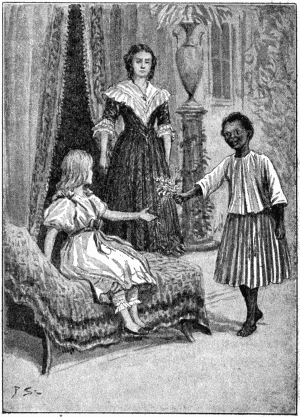Ogsaa Topsy havned i den verdensdel som hun havde sit udspring fra. Frøken Ofelia havde taget hende med sig til sit hjem i nordstaterne. Hun havde været en trofast mor for hende og opdraget hende i huslighed og gode seder. Efter at pigen var blit voksen, var hun blit døbt, og havde senere lagt sig efter at undervise børn. Presten paa stedet gav hende et rosende vidnesbyrd for dygtighed og hæderligt liv. I Afrika blev hun taget til lærerinde paa en missionsskole.