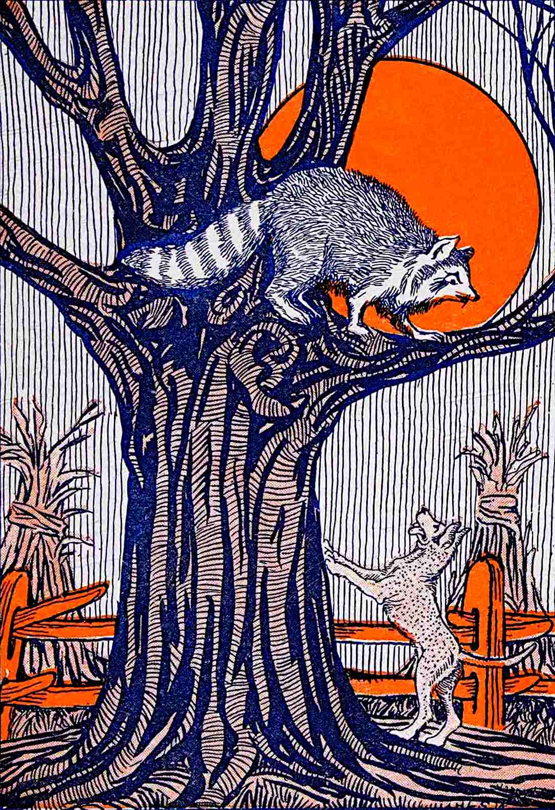 When Fatty Coon started off alone to find something more to eat, after finishing the fish that his mother had brought home for him, he did not know that he was going to have an adventure. He nosed about among the bushes and the tall grasses and caught a few bugs and a frog or two. But he didn’t think that that was much. He didn’t seem to have much luck, down on the ground. So he climbed a tall hemlock, to see if he could find a squirrel’s nest, or some bird’s eggs.