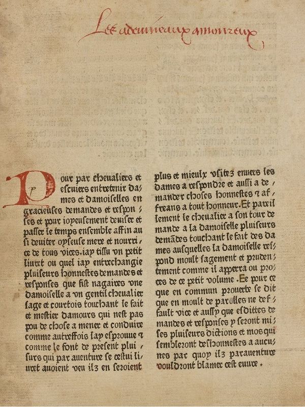 Sire chevalier puis que temps et loisir avons de deviser afin aussi pour mieulx et plus sagement gouverner et conduire ma gentillesse en honneur/ je vous supplie et requiers que me dittes tout premierement qui est la cause pourquoy on aime.