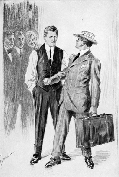 “Look pleasant, kid,” he continued threateningly. He pushed his way through the laughing group and overtook Evan a little way down the hall. He was a big chap, good-looking in a heavy way, and seemed to be about seventeen years old. He placed a hand on Evan’s shoulder and with a quick jerk swung him around with his back to the wall. Evan dropped his bag and raised his hands defensively.