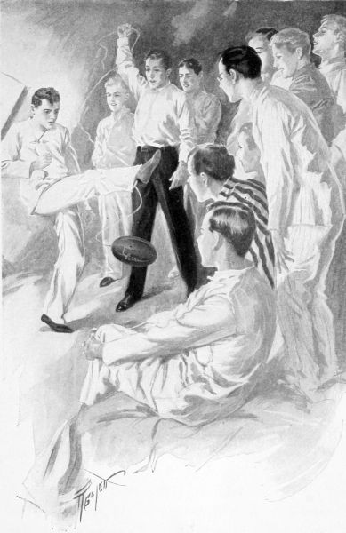 It was very still. Through the window, from where he lay, Evan could see thousands of bright frosty stars sparkling in the sky. That meant fair weather to-morrow, he told himself, and a dry field. Then his thoughts, in spite of[311] his utmost endeavors, went to the game, and presently he flopped over in bed and addressed the huddled form of his room-mate, seen dimly through the star-lit gloom:
