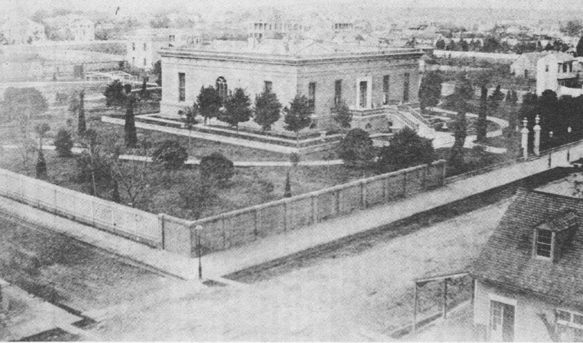 Italianate villa of James Robb, millionaire railroad man, was showplace of Garden District in the early 1850’s. It occupied entire block of Washington Avenue, Camp, Chestnut, and Sixth Streets. Rare works of art embellished its ornate rooms, landscaped gardens.