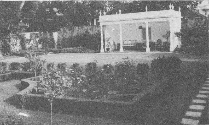 The spacious side garden of the Bell home uses many typical Southern materials bordering a wide sweep of green lawn. The towering palm is a species of date palm tree. On the trellises by the house are Carolina jasmine (Gelsemium sempervirens) vines. At the corner of the house is a large golden dewdrop (Duranta repens), a showy shrub which has bright yellow berries and racemes of small lilac flowers, frequently at the same time. Near this spot is a Lady Banksia rose (Rosa Banksiae), for many years a New Orleans springtime favorite. In summer the famous “Whitney pink” oleanders are especially striking. This variety was propagated by Mrs. Whitney’s gardener and is now one of the most popular in the Crescent City.