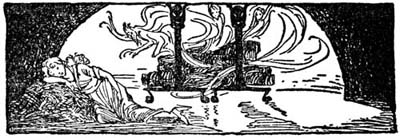 Slowly the King turned page after page, until at last he paused. “It is here,” said he. He and the Queen stooped above the book, reading the strange and crabbed letters written so many ages ago by the masters of fairy magic. When they had read the charm[12] through to the end, the King lifted his head: “None but those who work this charm may see it wrought,” commanded he. Then one by one the fairies passed from the royal bedchamber, leaving the King and Queen alone.