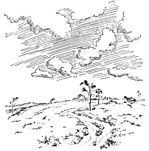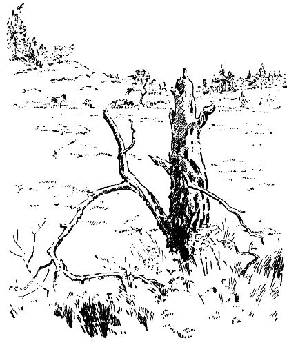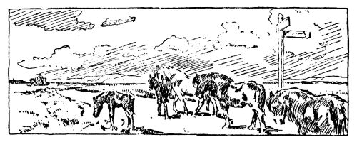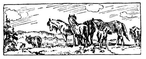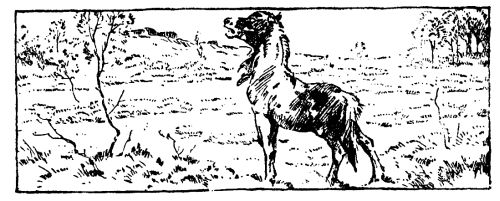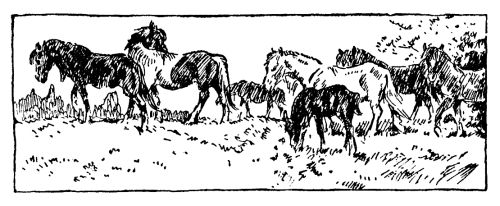 Below the ponies was a wide valley, covered with coarse grass, and dotted with hollies, gorse and stunted firs. The mares had chosen the hill for their afternoon siesta because up there were fewer flies and biting torments than down below in the swampy bottoms, where, earlier in the day, the ponies had been feeding. They stood mostly in pairs, head to tail, so that the swish of the latter drove the flies from their noses and flanks. Once in a while, a yearling—that is, one born the previous year—finding the sun too hot, butted in between the mares.