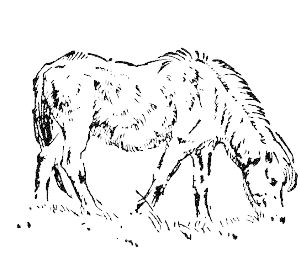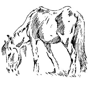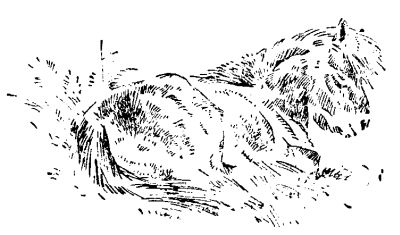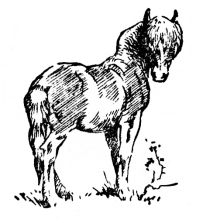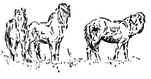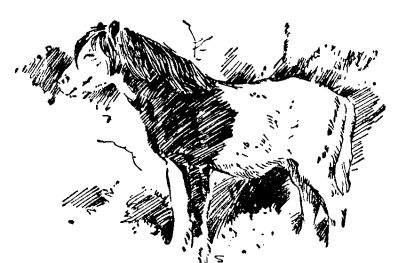 Standing by themselves were two dingy brown ponies, a mare and a two-year-old, shorter of leg than the other adults. Their necks showed little of the arch of a well-shaped animal—indeed, both ponies were almost donkey-like in shape, with hollow backs, drooping bellies, and “cow-hocked” hind-legs. The mare had a beard hanging below her chin.