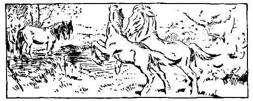 How pleasant the colts found the water, enjoying the splashing of their hoofs as they walked in the stream, the while their elders stood fetlock-deep! How refreshing to take a deep drink, head and neck inclined at just the right angle so that the nostrils were clear of the water, followed by a snort of content!