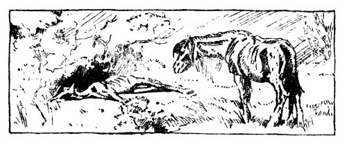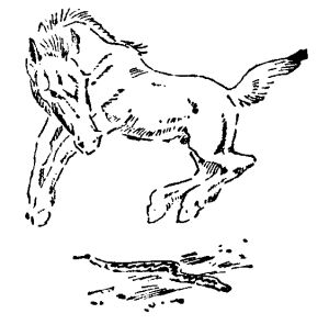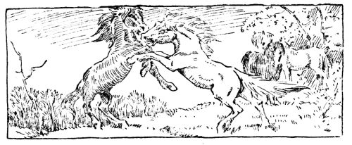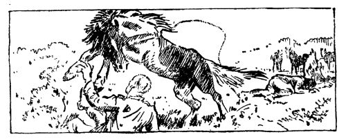 Directly the pressure of the noose was removed from the pony’s windpipe, he revived, and rose to his feet breathing hard. Then as the man reached him and took hold of the noose, he reared, pulling his liberator off his feet, to fall beneath the plunging hoofs. The stallion, seeing a persecutor lying prostrate, and being full of anger at his treatment, with a scream of fury, flew at him, kicking and biting. Then he seized an arm in his teeth and savaged it. Launching a final kick, he galloped to his herd, the rope trailing on the ground.