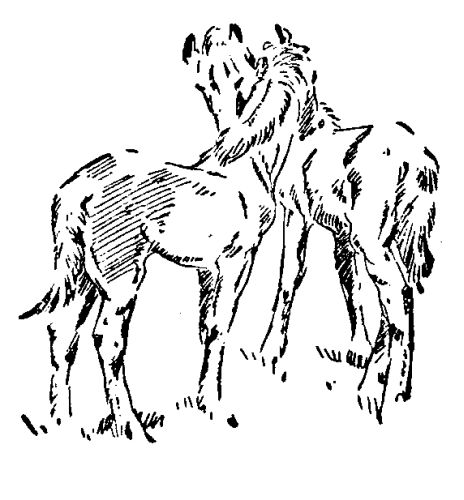 In the late afternoons before the long evening feed, the pair would gambol with all the abandon of youth, while their mothers stood head to tail, jerking manes, waving tails, shaking fore-legs, and ever and anon changing the weight from one hind-leg to another. The colts would race across the meadow where the herd was pasturing, then stop dead, and stand nose to nose, watching for the other’s next move; one would rear up suddenly, startling his playfellow, and race away in glee. Then followed a biting of manes and nibbling of shoulders like any old couple. At times they grew rougher in their play. They ran shoulder to shoulder, trying to bite, or, rearing up on hind-legs like veterans, indulged in an orgy of make-believe biting and kicking.