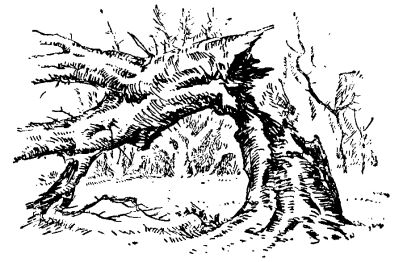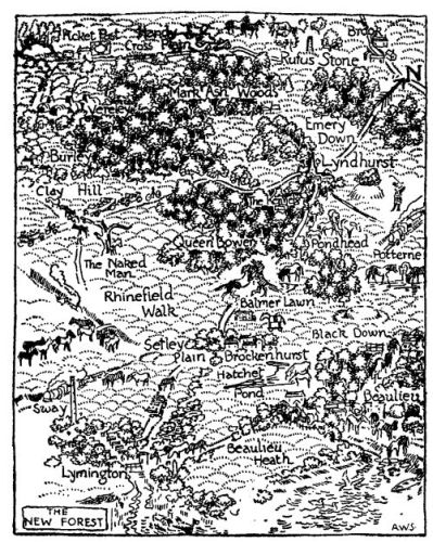 Beyond the company was a great expanse of blue sky flecked with pinkish cloudlets, and, on the horizon, blue and violet wooded heights, a crinkly contour denoting oak and beech and an evenly serrated line, plantations of firs. As everyone who has journeyed from Southampton to Bournemouth by road or rail knows, a great part of the forest is open heath or moorland; but, unlike the barren wilds of the Highlands, the New Forest has also extensive woods full of gigantic oaks and beeches, while the open ground in many places is becoming choked with self-sown firs.