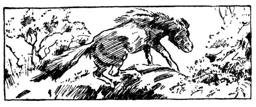 Presently a shrill whistling call was heard, and the mares showed signs of animation; ears were pricked up and heads flung round. Up the hill came the stallion with a pounding step. He was a bright bay with a big white blotch on his back. His forelock covered his white forehead blaze, and his eyes also, for all one could see. The black hair of his mane and tail was crimped or waved, unlike the lank locks of the mares. He moved with a vigorous action, lifting his feet high, and with a long stride. He carried his tail with a finer sweep than the mares, while his mane rose and fell with the energetic movement of his neck. His coat was glossy, and the high lights rippling to and fro on the bright sienna surface were golden in the sun and blue in the shade. When he reached the summit he stopped, looking back with twitching ears. He snorted and hurried to the group of ponies, and past them, then stopped, and the herd, understanding, prepared to follow their leader, the mares calling to their recumbent foals, which rose to their feet and stretched before cantering to their mothers. The cavalcade moved off, only the dappled grey remaining motionless. She was wilful or lazy. The stallion took a few quick paces back and touched her with his nose as a hint to move on. She whinnied crossly and tried to strike him with a fore-foot. He lowered his head, bared his teeth and snorted, whereupon she thought better of it, and moved off. The stallion trotted to the head of the column, and looked round to see that all were following.