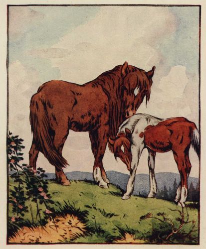 The little skewbald foal kept away from the other youngsters, for they were too big and strong for him to play with; but by good fortune a brown mare with a colt of the same colour, and about the same age as Skewbald, joined the party. What with milk and nibblings of heather and the lush grass of the bottoms, the little foals grew apace and became playmates.