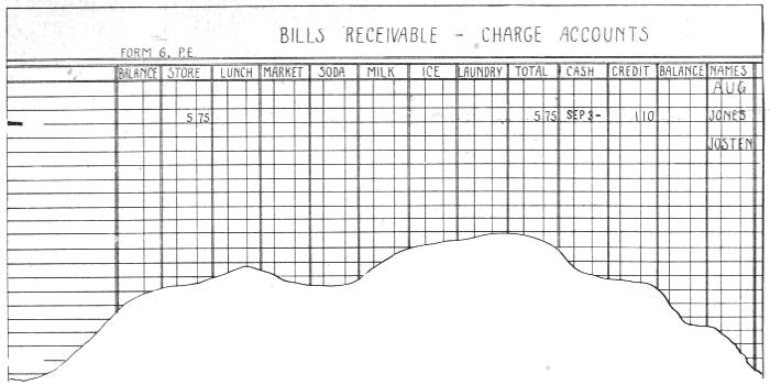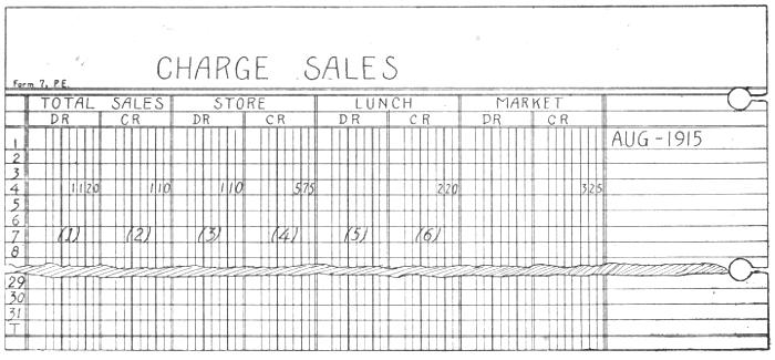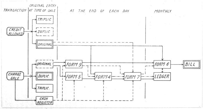 Take retained sales slips for at least three different days and select, at random, at least five sales on each. Are these sales entered on Form 9?... Compare several consecutive sales on each day’s record with adding machine and cash register strips.... Are the totals for each of these days entered on the Steward’s daily report, Form 4?... Are these entries on Form 4 supported by clerks’ reports, Form 5, for same totals?... Are the total charge sales on Form 4 correctly transferred to the daily summary shown on Form 7?... Do they check with Form 6?... Has the Bills Receivable account in the Ledger been debited with the total shown on Form 7?... Have amounts shown on Form 7 been credited to the various departments in the Ledger?... Have all credits been entered on Form 6?... Are[101] they charged against the various departments?... Are they credited to Bills Receivable?... Are they noted on Form 4?... In separate list, show what bills have been due the Exchange for more than one month.