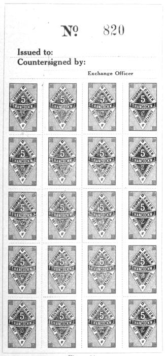 It is apparent that if we can be sure that all sales are rung up on the register the Exchange can suffer no loss except by persons taking stock from the shelves, a proposition which is cared for by our stock records. Therefore, it is important to devise means for insuring that every sale is properly rung up. There are various means to this end. One is to provide a series of locked boxes, one for each organization at the post, each[106] provided with a slit in the cover large enough to admit a chop ticket. These boxes to be plainly labelled with the designation of the respective organizations, and all customers to be instructed to drop their chop tickets into these boxes. Whenever dividends are declared, a certain proportion of same to be divided in the same proportion as exists among the total values of the tickets in the various boxes. Unless these tickets are counted by a committee from the various organizations, this scheme would entail considerable clerical work for the Exchange office force. The scheme practically amounts to distributing a part of the dividend according to the amount of business done by the respective organizations—a necessity in the rare case when one or more organizations boycott the Exchange. It is said that the members of the various organizations soon become efficient agents in promoting the practice of customers demanding the chop tickets from the clerks.