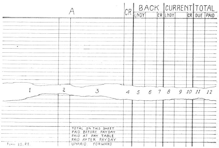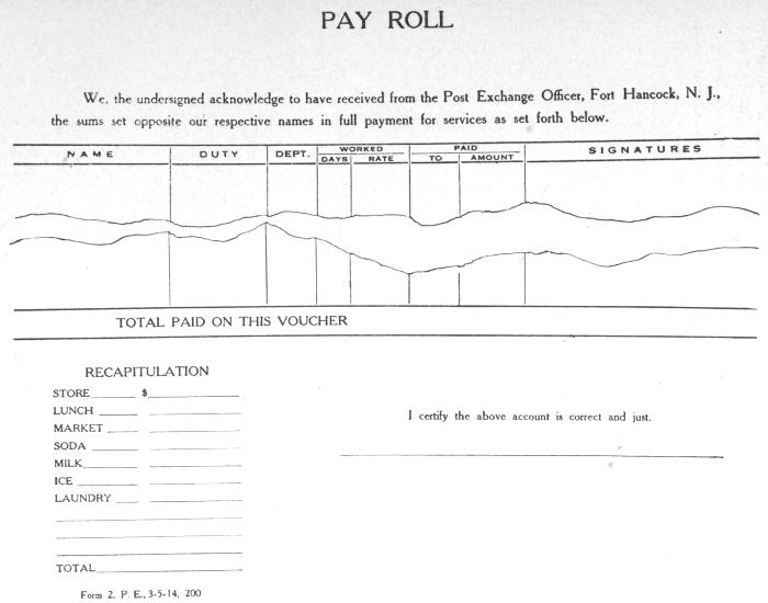 A thoroughly satisfactory form for pay rolls is shown by Form 2 in Fig. 33. The Recapitulation at the bottom of the form is for the purpose of distributing the cost of labor among the various departments when we[88] make out our statement of income and profit and loss. If employees are not paid up to date, that is, if a part of their pay due is withheld, this form allows such information to be recorded. In some cases, it has been found practicable to pay off three times a month, especially in the case of civilian employees. In any case, all hands should be paid promptly at the last of the month, thus getting all of these wages out of the way and avoiding the necessity of any reversing entries or other expedients to show the real operations of the Exchange. If any wages due the employees are not paid by the end of the month, these amounts become “accrued wages” and must be carried as such.