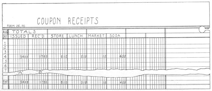 Do the total coupons sales shown on Form 4 for the selected days agree with the cash register records for these days?... Are entries on Form 4 correctly posted to Form 26?... Are total coupon sales for each department shown on Form 26 credited to these departments in the Ledger?... Are total coupon sales debited to Check Account in the Ledger?... Are coupon books on hand safely stored?... Are they correctly accounted for?... What value of coupons issued during the month of which there is no record?... Are total coupons issued during the month correctly credited to Check Account in the Ledger?... Are they properly debited against Bills Receivable, Credit Coupons?... Is there any ground for believing the stated value of coupons outstanding to be erroneous?... Any complaints from men that they are erroneously charged for coupons?... Is total cash received for coupons (shown in cash book) credited in Ledger to Bills Receivable, Credit Coupons?... Deduct from the total coupons entered on all Forms 25 the amounts shown in cash book as received for coupons; is the remainder properly supported by unpaid Forms 19?... Have these unpaid amounts been properly entered on Forms 25 for next pay day?... What efforts made to collect payments on coupons past due?...