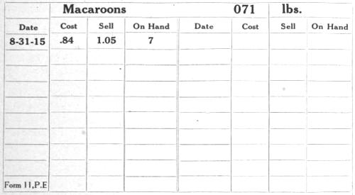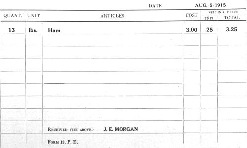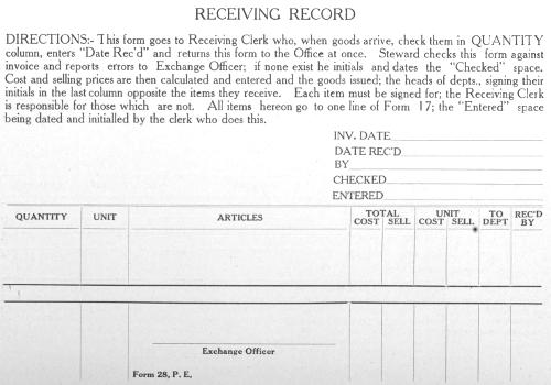 This is done by some employee designated by the Exchange Officer; sometimes it is done by the Exchange Officer himself. It is sometimes prescribed by the Council that when organizations (shareholders in the Exchange) order articles not in stock, the selling price shall be actual cost to the Exchange of such articles. This cost would, of course, include any transportation charges, etc., that were incurred, but the Exchange would get the benefit of all cash discounts. It is also prescribed in some instances that persons not stockholders in the Exchange who order merchandise that is not in stock shall be charged a commission of 5%. Both of these rules are sound, because, in the first case, any profits made by the Exchange would simply revert in dividends to the organizations from which the profits were made, assuming that all organizations transacted the same amount of this kind of business. If they did not, it would still be unjust to penalize one company for patronizing the Exchange by taking from it money for distribution in dividends to other companies, regardless of the amount of patronage the latter gave the Exchange. The second rule is sound because the transaction is a quick sale, and the money of the Exchange is tied up in stock for the minimum length of time. The selling price in the above cases is, therefore, very easily determined.