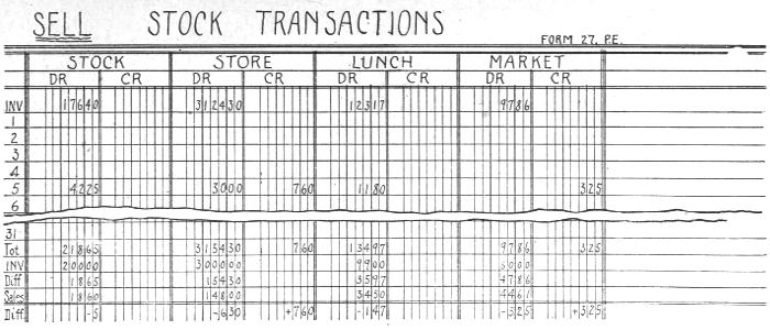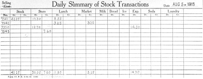 These are taken in the same general way as in other branches of the Exchange except that the cost price alone is considered. When finished, the totals shown by the various cards are added on the machine and the result given to the Exchange book-keeper in order to permit him to make out the profit and loss sheet. The cards are filed in a card index drawer until they are used up, when they may be transferred to a dead file.