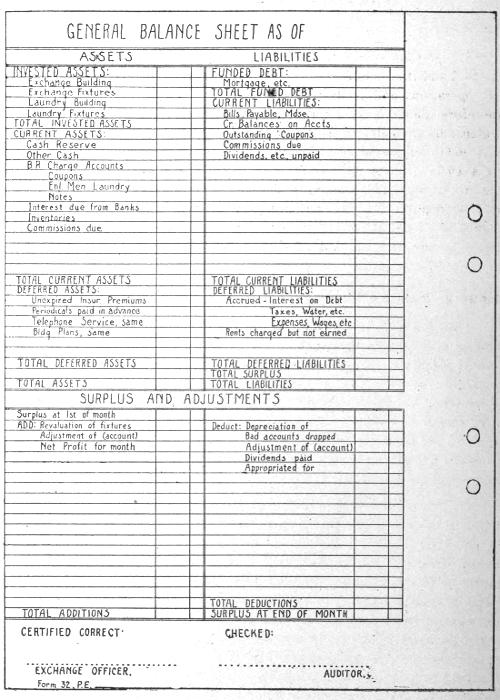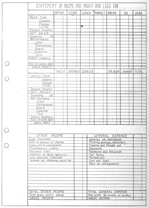 In the foregoing pages, the writer has attempted to outline a system of record-keeping for our Post Exchanges that is at once simple and efficient, complying with the desiderata set forth in the opening pages. No contention[107] is made that the system is perfect and incapable of improvement; but it is the best that the writer has seen in twelve years’ experience with Post Exchanges. It is hoped that it will at least prove worthy of being taken under advisement by most Post Exchanges and many of its points put into practice. Strenuous efforts have been made to explain the system in such simple language that the average employee of an Exchange could install and operate it, without the necessity of the Exchange Officer devoting his personal efforts to it. An effort has also been made to simplify matters for the Exchange Council and for officers detailed to audit the accounts, to show what points are important and what are not, how to secure a clear idea of what the business is actually doing in all its branches, and how to prevent leaks.