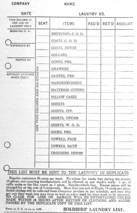 At the beginning of each month, each organization makes out a list of the men in the company, a carbon copy of Form 25 is the easiest to furnish. On the first day upon which any organization sends wash to the laundry, some designated N.C.O. of that organization marks in the first blank column opposite each man’s name, information as to whether or not he sent laundry on that date. Such entries would be “YES” (by using a rubber stamp) if the man sent laundry; “S”, if he did not, through being sick in hospital; “A”, meaning temporarily absent; “D”, meaning discharged, etc. When the batches of wash belonging to this organization are received at the laundry and each bundle or batch has been checked as before described, the entries on the consolidated list are checked against the original laundry slips as the latter are being placed in the binders. This is to insure the correctness of the consolidated list. After this is done, the consolidated list is returned to the organization, and the above operations are repeated upon every succeeding wash-day during the month.
