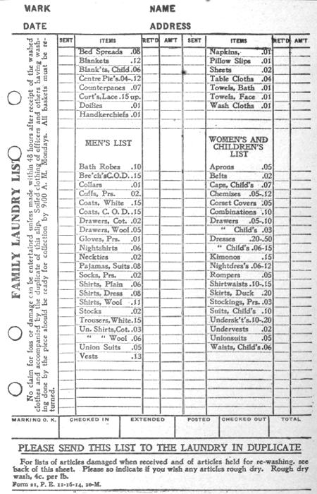 The original slips are inserted in alphabetical order in loose-leaf binders, one binder for each organization. These binders should have a 2 inch back in order to hold one month’s slips conveniently. They form our retained record and are invaluable in case of disputes. The duplicates are given to the men when they come for their wash. While it is a great convenience to the men to be permitted to get the wash of their friends, at times, it has been found that this privilege is abused. In such a case,[95] each man may be compelled to come for his own wash, which will be found to have a salutary effect. Ordinarily, it is sufficient to tear off the top of the duplicate slips at the time of delivery, thus showing that the wash has been called for and delivered.