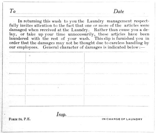 This, Form 24, shown in Fig. 36, should be made up in the form of a duplicating pad, 3 × 5 inches being a standard size. One copy of this form, preferably, the original, is retained in the book or filed in a card index drawer; the duplicate is returned to the proper customer with his wash in which the damaged articles were found. As before noted, when damaged clothing is found in any wash during the “marking in” process, the damaged articles are placed aside. They are then entered on this form, inspected by the officer in charge, or person designated by him, and then sent through the wash.