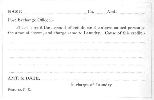 When a claim for damages, loss, etc., is settled in favor of the claimant a report should be made on Form 22 (See Fig. 37), to the Post Exchange. This form should be made up in triplicating pads, one copy for the Exchange book-keeper; another, plainly stamped “duplicate”, for the claimant, and a third to be retained by the Laundry, either in the book or in a card index drawer, preferably the latter.