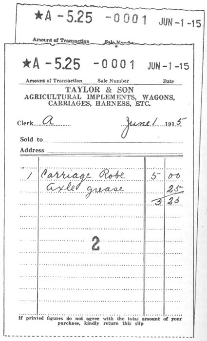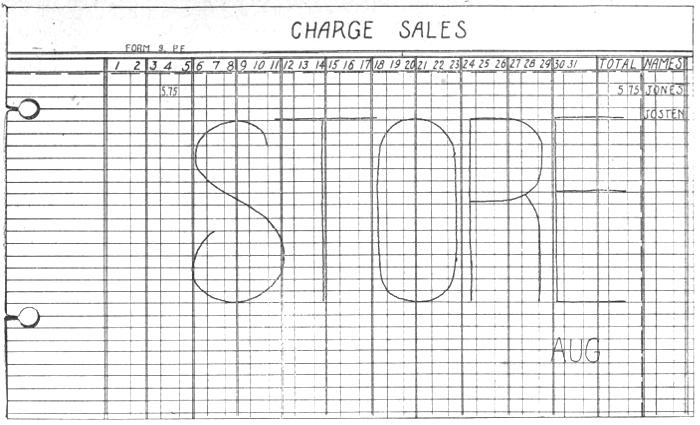 A modern development of the cash register is the “Slip Printing” device. By this, we mean the printing of the amount of sale on the sales slip itself, instead of on the “chop ticket”. In our system of recording charge sales, where the customer is given a copy of the sales slip, it is unnecessary for him to have the chop ticket, too, but it is necessary for us to know that his sales slip calls for the same amount that has been rung up on the register. For this purpose, the register can and should be arranged for “Slip Printing”, that is, for printing directly on the sales slip whatever amount is rung up on the register. This arrangement can be made without[104] extra cost in the case of a new machine. The sales slip then handed to the customer then shows him exactly what amount was rung up on the register. The slip shown in Fig. 1 was treated in this way, although the slip was not originally designed for this work. Another slip is shown in Fig. 38. A cash register embodying the above described characteristics is shown in Fig. 39.
