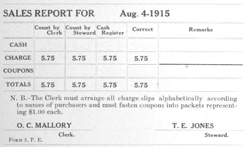 In order to secure the maximum benefit from a cash register, however, it should be suited to the work in hand. Many registers handle but two kinds of sales, charge and cash; but we have a third kind, coupon sales, and the registers in use by every department which handles all three kinds should be arranged for such work. This kind of a register has three separate adding mechanisms, the appropriate set being thrown into mesh by means of a movable clutch and indicator at the left of the keyboard. In ringing up each sale, the clerk sets the indicator at “cash”, “coupons” or “charge”, as the case may be, before turning the handle; the total sales of any kind can be read at any time by anyone possessing the key which unlocks the reading window. Thus, the Steward, at the close of business on any day, can ascertain these totals in a few seconds, instead of having to transfer them from the cash register record tape to the adding machine. Thus, considerable time and labor are saved.