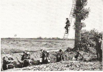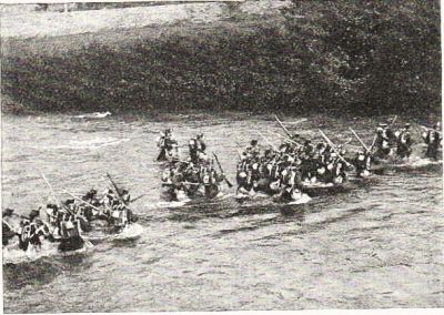 The stillness of the night is disturbed by the thunder of heavy artillery and the fitful report of rapid-fire and machine guns. Shells go screeching about them, throwing columns of water high in the air as they strike it with a baffled hiss.