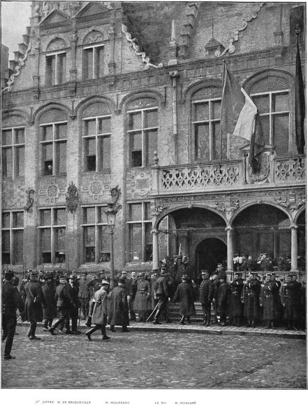 Le roi Albert et le président de la République française, suivis de M. Millerand, du général Joffre et de M. de Broqueville, pénètrent dans l’Hôtel de Ville de Furnes, à quelques kilomètres du front de combat, le 1er novembre.