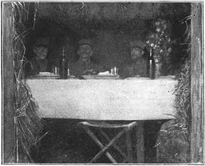 Ensuite, le colonel, qui nous avait priés à déjeuner, nous introduisit dans la salle à manger qui est de construction et de style 1914: trois marches pour y pénétrer, des murs uniformément bruns—terre de Sienne, si vous voulez—un plafond aux poutres apparentes sur fond de gerbes de blé, assez haut pour permettre au plus bel homme du régiment de se tenir debout sans courber la taille... Coquetterie: la table, à la nappe blanche immaculée, était parée de fleurs.