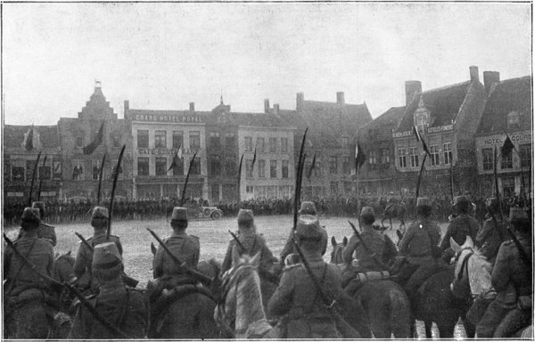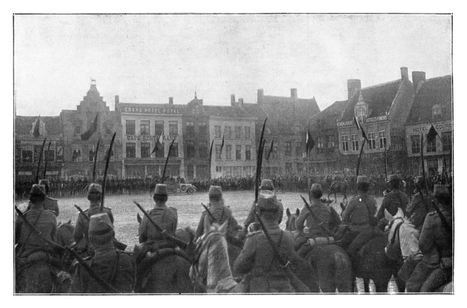 De là, les deux chefs d’Etat, avec les deux ministres de la Guerre et le général Joffre, gagnaient Furnes, que nos avions protégeaient contre les taubes. Des troupes, belges et françaises, étaient massées sur la place de l’Hôtel-de-Ville. Le roi et le président, aux accents de la Marseillaise et de la Brabançonne, les passèrent en revue. Une longue et affectueuse entrevue suivit, dans l’un des salons de l’Hôtel de Ville, à la suite de laquelle le roi tint encore à reconduire M. Raymond Poincaré aussi loin que possible, dans la direction d’Ypres, où opèrent avec une endurance, une ardeur admirables, des troupes françaises au milieu desquelles le président, le ministre de la Guerre et le généralissime allaient terminer leur journée.