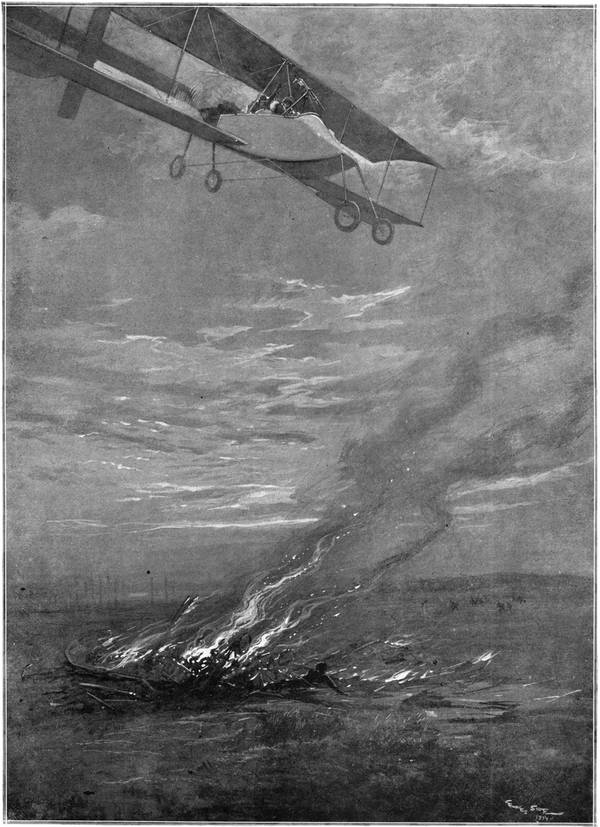 Si les aviateurs des diverses armées alliées accomplissent chaque jour des prouesses, ces exploits n’ont en général pour témoins que les bataillons ennemis; les nôtres les connaissent seulement par le rapport ou... par les journaux. Pourtant, il n’est pas un soldat du front qui ne rêve d’assister à un combat aérien, prêt à applaudir aux derniers tournoiements de l’avion allemand blessé à mort. De ces rencontres il n’a encore été pris, il ne sera peut-être pris aucun cliché. Des indications et un croquis fournis par un spectateur du combat que nous avons déjà mentionné (numéro du 24 octobre) ont du moins permis d’en représenter très exactement la phase finale. C’était à Jonchery, près de Reims. Un avion allemand, du type «Aviatik», après avoir survolé nos troupes, se préparait à regagner son camp. Aussitôt, le sergent Frantz et le soldat Quenault s’envolent sur un biplan armé d’une mitrailleuse. Arrivé à une grande hauteur, l’appareil français attaque son adversaire de flanc: bientôt le moteur de celui-ci explose, déterminant l’incendie de l’appareil qui s’abat lourdement dans les lignes françaises. Des deux côtés les soldats étaient sortis de leurs tranchées pour mieux suivre les péripéties du drame. Tandis que les débris de l’ «Aviatik» achevaient de flamber près de deux corps carbonisés, ils virent le biplan français descendre majestueusement, en décrivant de grands orbes autour du brasier.
