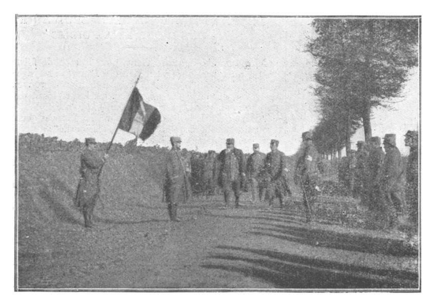 J’étais de la fête et c’est une des plus belles fêtes de ma vie. Jamais je n’ai vu plus de grandeur dans pareille simplicité, jamais semblable cérémonie n’avait revêtu pour moi une telle signification! Et jamais, non plus, le drapeau ne m’avait paru plus clair, plus gai, plus crâne, plus beau, plus chérissable que sur cette route, au milieu de ces cultures, dans cette plaine, au-dessus de laquelle, inlassablement, depuis trois semaines, court le métal porte-destin.