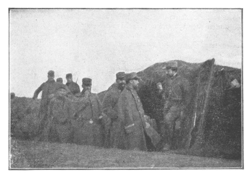 UNE CÉRÉMONIE MILITAIRE SUR LA LIGNE DES TRANCHÉES.—La remise de la croix de la Légion d’honneur à un aide-major blessé.