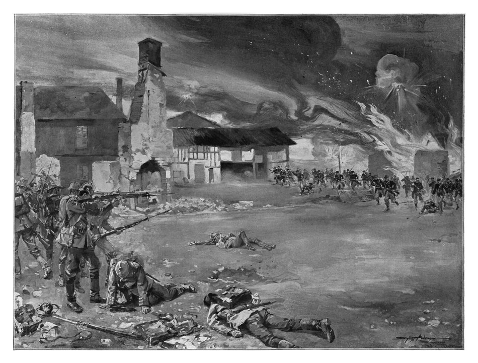 Dessin exécuté par M. Sydney Adamson, à Sommesous (village de la Marne, non loin de Vitry-le-François), d’après les indications précises d’officiers ayant participé aux combats de septembre sur ce point et qui ont certifié exacte la composition de l’artiste anglais.