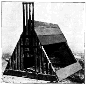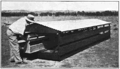With the latter type of house, feeding and watering must be done outside, preferably with a covered feeder, as shown in figure 15. A cheaper portable coop, not so high and with framework of lighter material, is shown in figure 22. This coop is built on 4- by 10-inch skids and is equipped with raised wire floor and with roosts.
