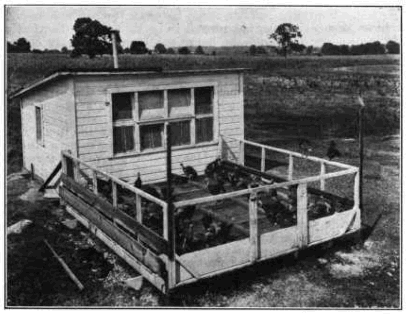 In Minnesota a successful system of moving poults around the colony brooder house has been devised and is giving excellent results. The house is built with a small opening in each side, and a portable frame is so placed that the ground on each side of the house can be used as a small outside run. The birds are allowed to range to the south for from 5 to 10 days; then the house is thoroughly cleaned and the range changed to the west; and so on until the land on all four sides of the house has been utilized. The house is then moved to a clean spot, and the rotation is repeated. After the birds are from 8 to 12 weeks old the house is again moved to a clean place. Turkeys may be raised successfully on a small acreage if they are moved to a clean area each week or two and to an entirely different, clean area each year.