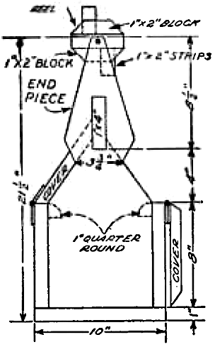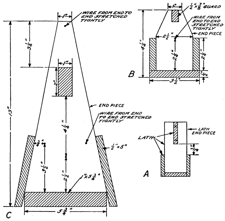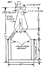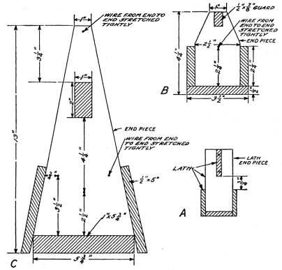 Small trough feeders made of lath (fig. 12, A) may be used from the first day in the brooder and until the poults are a week old. Such feeders are made with 1 lath for the bottom, 2 for the sides, small sections for end pieces, and another lath for a guard to keep poults out of the trough. For poults from 8 days to 4 weeks old it is better to use large trough feeders made of 1/2- by 21/4-inch boards for the sides with a top guard consisting of a free-turning reel. Baling wire stretched inside the troughs (fig. 12, C) aid in preventing waste of feed and also serve as beak cleaners for the birds. To prevent waste, it is better not to fill most trough feeders more than two-thirds full. In the brooder house it is important to « 32 » place feeders on a wire platform made of 1-inch mesh, 16-gage wire, and 1- by 4- or 1- by 6-inch boards. Poults 5 to 12 weeks old should have trough feeders made of 1/2- by 5-inch boards for the sides, with a free-turning reel at the top. For poults from 12 weeks old to market age the feeders should be even larger, as illustrated in figures 13 and 14.