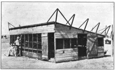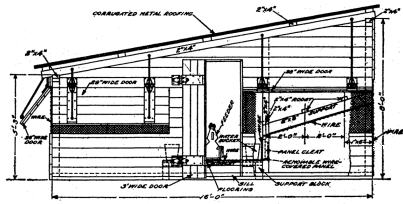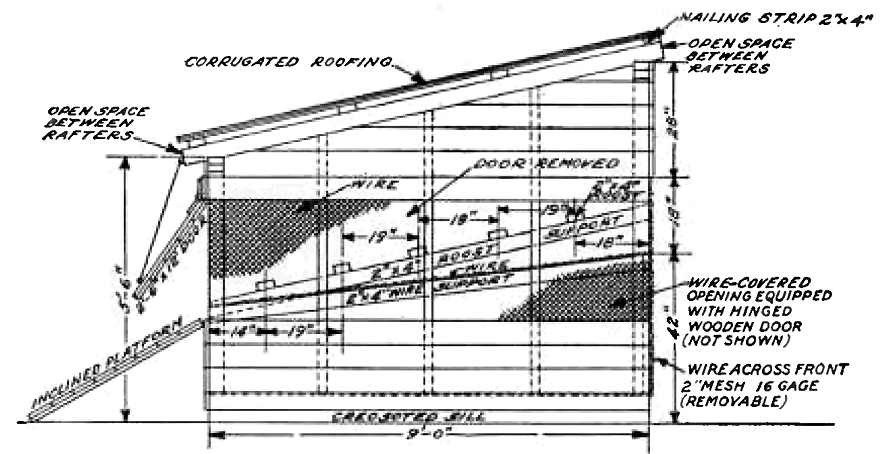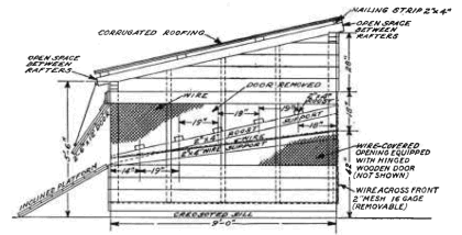 A permanent house should face south or in a southerly direction so that the front is not exposed to storms. Board sides on the north and west are desirable. Practically open-air conditions, combined « 35 » with good protection, may be obtained by leaving wire-covered openings about 2 or 21/2 feet wide across the north, west, and east sides at about the level of the roosts. These Openings should be made closable by shiplap doors that may be partly opened in warm weather and closed during cold weather and storms. The south side may be left entirely open except for 1-inch hexagonal mesh of 16- or 18-gage wire and enough boards to give strength to the building and protect the birds from rainstorms.