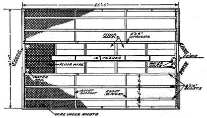 The space beneath the roosts should be fenced off and covered with 11/2-inch, 18-gage wire mesh to prevent the birds from getting at the droppings. This wire should be placed either on the under side of the roost supports (fig. 17) or on special wire supports (fig. 21), and it should be 6 to 12 inches below the top of the roosts. When a wire-floored alleyway is used, removable vertical panels made of 1- by 4-inch boards covered with the 11/2-inch hexagonal, 18-gage wire mesh should be placed directly under the roosts which border the alleyways in such a way as to close the opening underneath the roosts (fig. 19).