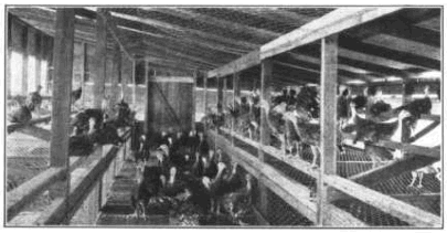 When birds are herded on free range some growers move the roosts, feeders, and water vessels to clean ground several times each season, whereas others use permanent roosting and feeding quarters and bring the birds back each night. In either case excessive contamination at any one point should be prevented so far as possible.